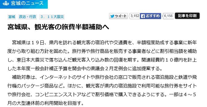 宮城県は19日、県内を訪れる観光客の宿泊代や交通費を、半額程度助成する事業に新年度から取り組む方針を固めた。旅行券や旅行商品を販売する事業者などに割引相当額を補助し、東日本大震災で落ち込んだ観光客入り込み数の回復を期す。関連経費約10億円を計上した本年度一般会計補正予算を開会中の県議会2月定例会に追加提案する。