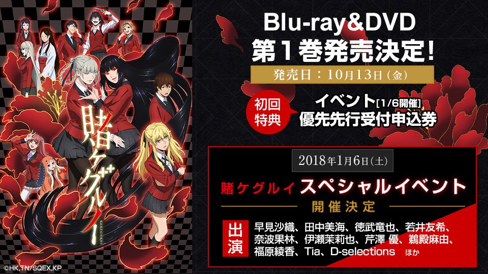 【告知】 #賭ケグルイ BD&DVD発売決定!特典として原作尚村透先生描き下ろし三方背ケースが付属!さらに2018/1/6イベント開催も決定。イベント優先先行受付申込券はBD&DVD1巻に封入されます! pic.twitter.com/5wUFNjSIGY